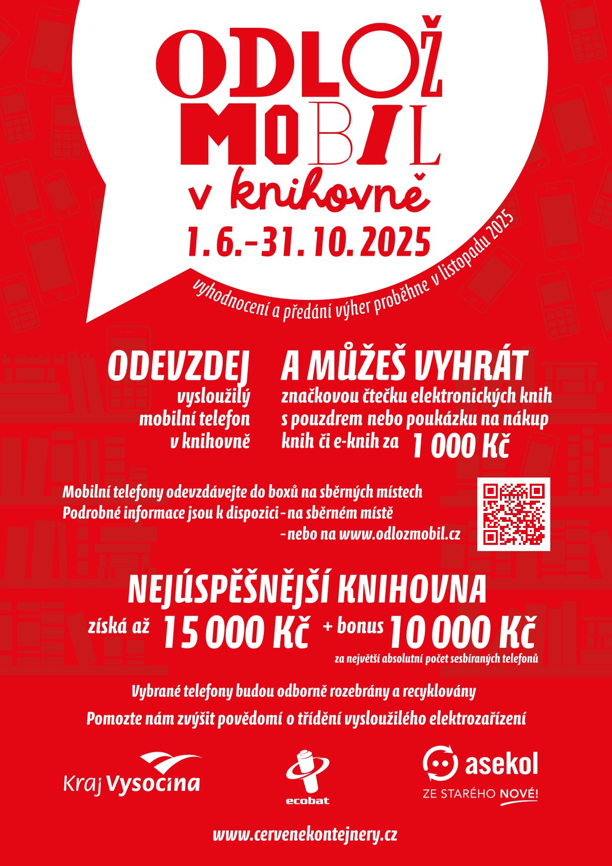 V rámci kampaně na podporu třídění vysloužilých elektrozařízení můžete v době 1.6. - 31.10.2025 v knihovně nebo v kanceláři úřadu městyse odevzdat vysloužilý mobilní telefon a zapojit se tak do soutěže, ve které můžete vyhrát čtečku elektronických knih nebo poukázku na nákup knih v hodnotě 1 000 Kč.