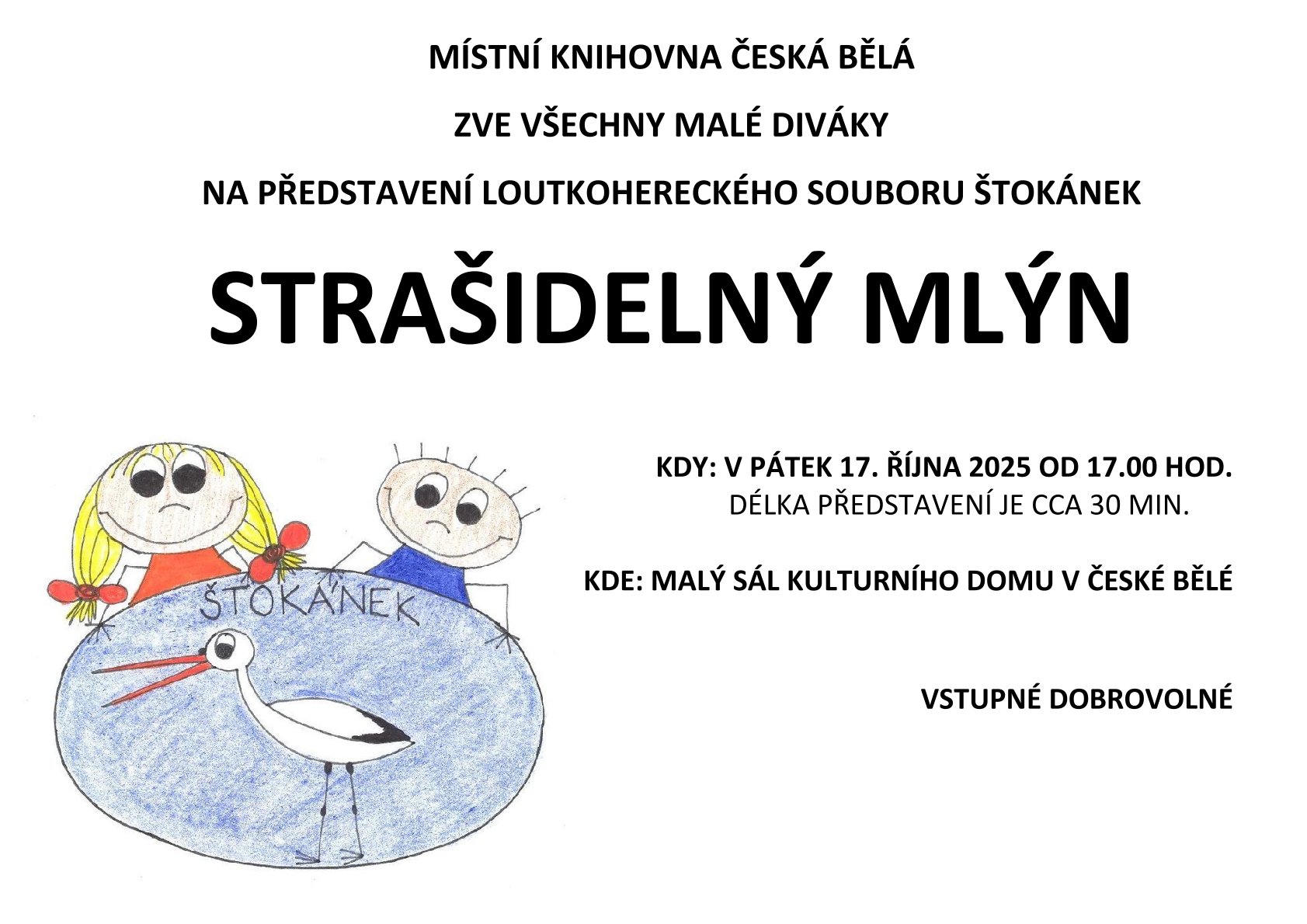 Místní knihovna zve všechny ve věku 3 -99 let na divadelní představení ANDULKA A LOUPEŽNÍCI, které proběhne v pátek 12. května 2023 od 17.30 hod. ve velkém sále Kulturního domu v České Bělé.